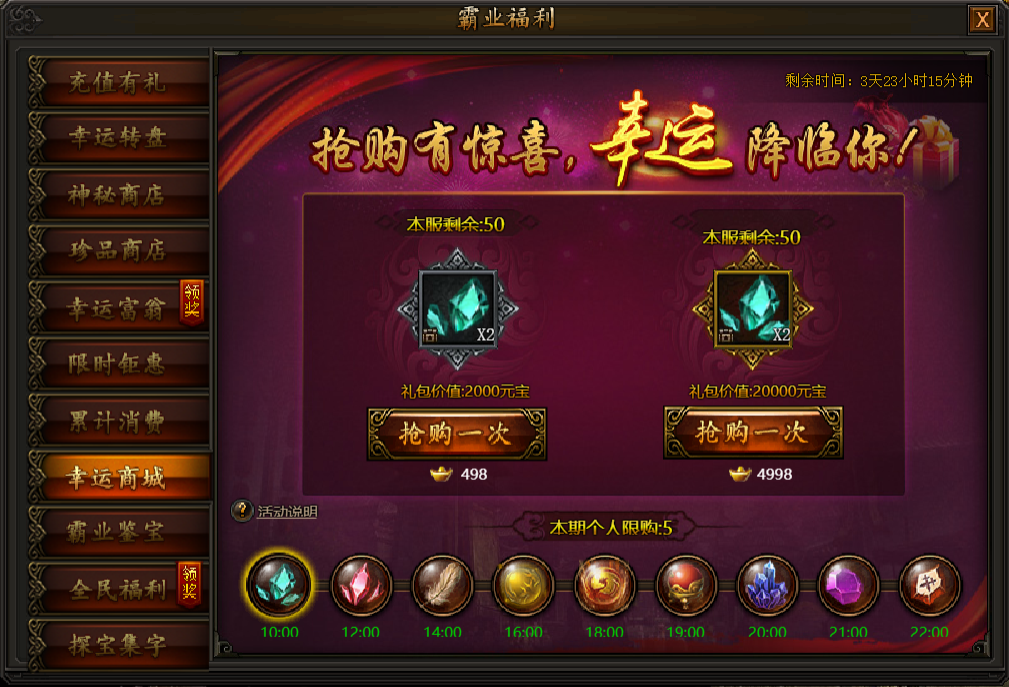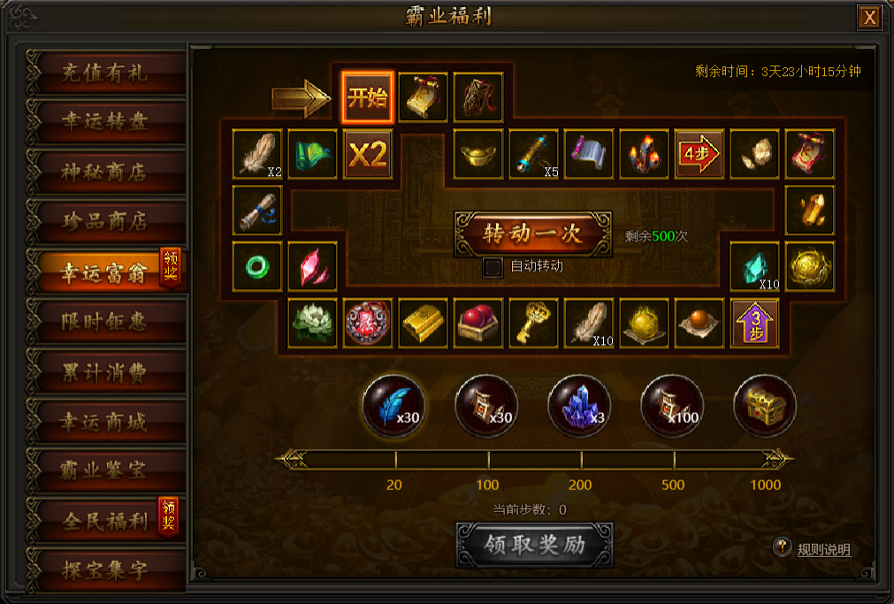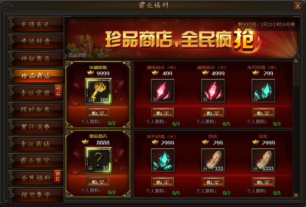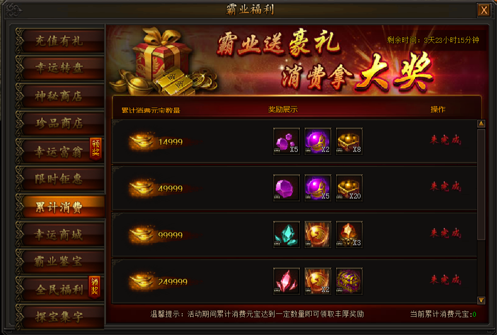 霸业福利,海量材料送不停! 1. 充值有礼 活动时间:2018年6月22日0点——6月25日23:59 活动期间,充值元宝即可领取五档丰厚奖励,每天均可领取一次,不容错过! 2. 幸运转盘 活动时间:2018年6月22日0点——6月25日23:59 活动期间,充值并消费一定元宝即可使用幸运转盘,获得大量元宝道具,机会不容错过。 3. 神秘商店 活动时间:2018年6月22日0点——6月25日23:59 活动期间,每两小时神秘商店会自动刷新一批道具,也可花费元宝立即刷新,大量道具限时等你抢购。 4. 珍品商店 活动时间:2018年6月22日0点——6月25日23:59 活动期间,每天会随机刷新一批特价道具,花费少量元宝即可购买,每个道具均有每天最大个人购买次数限制,部分道具有购买vip等级限制,买到就是赚到,机会不容错过! 5. 幸运富翁 活动时间:2018年6月22日0点——6月25日23:59 活动期间,充值一定元宝即可参与幸运大富翁,获得丢骰子次数,转动骰子即可获得踩中格子上的豪华奖励,多次参与累计步数,更有机会得到时装宝箱和极品转生装备奖励! 6. 限时钜惠 活动时间:2018年6月22日0点——6月25日23:59 活动期间,材料礼包限时折扣,超低价格,不容错过! 7. 累计消费 活动时间:2018年6月22日0点——6月25日23:59 活动期间,累计消费一定数量元宝,即可领取对应档奖励,每个角色只能领取一次。 奖励内容根据开服天数不同而不同,具体奖励内容如下: | 2018年6月22日开服天数不足60天 | | | | | | | | | 宝石结晶(大)*1、超级轮回丹*1、公会技能秘籍*10 | | 魂珠碎片(大)*1、超级轮回丹*2、剑皇时装箱*1 | | 宝石结晶(大)*2、羽毛*300、转12首饰箱*1 | | 魂珠碎片(大)*2、羽毛*300、转14首饰箱*1 | | | | | | | | | | 宝石结晶(大)*1、超级轮回丹*1、超级灵印精华*3 | | 魂珠碎片(大)*1、超级轮回丹*2、剑皇时装箱*1 | | 宝石结晶(大)*2、羽毛*300、转12首饰箱*1 | | 魂珠碎片(大)*2、羽毛*300、转14首饰箱*1 |