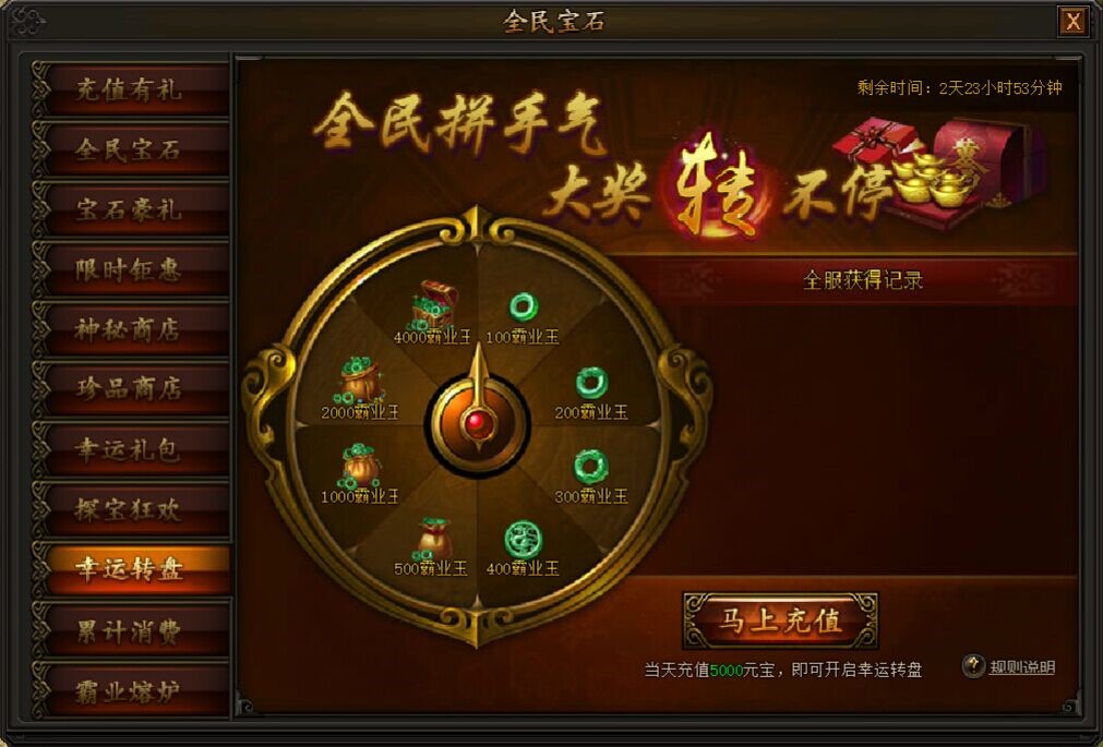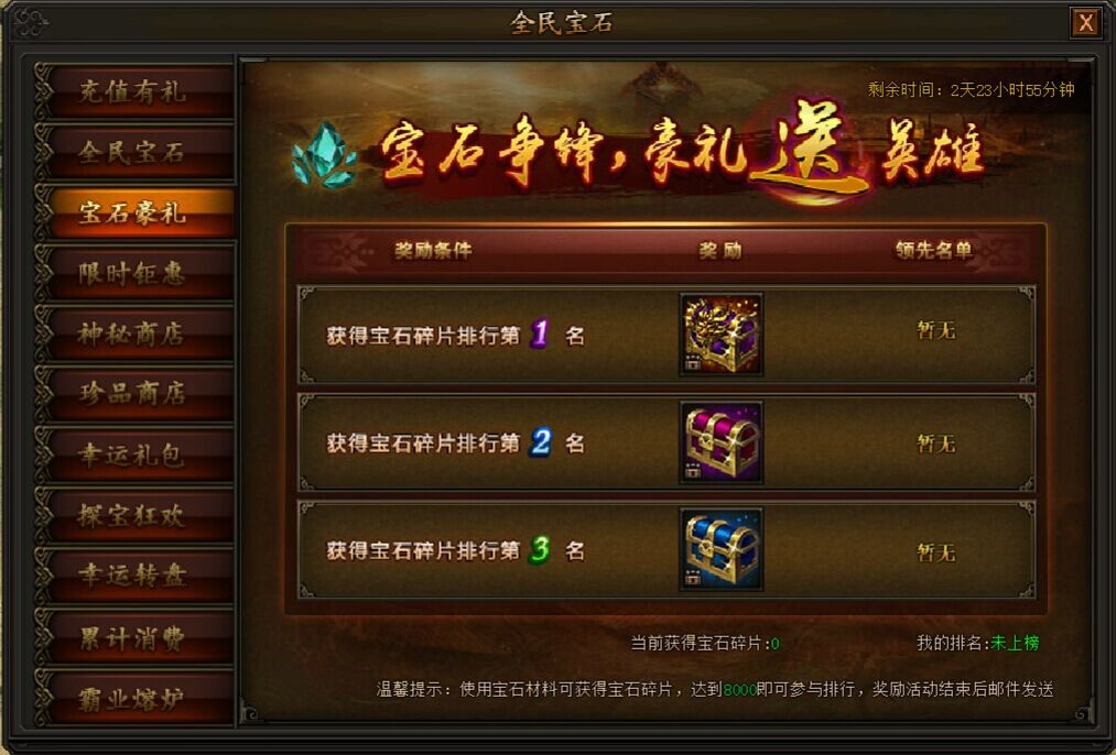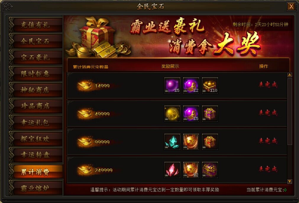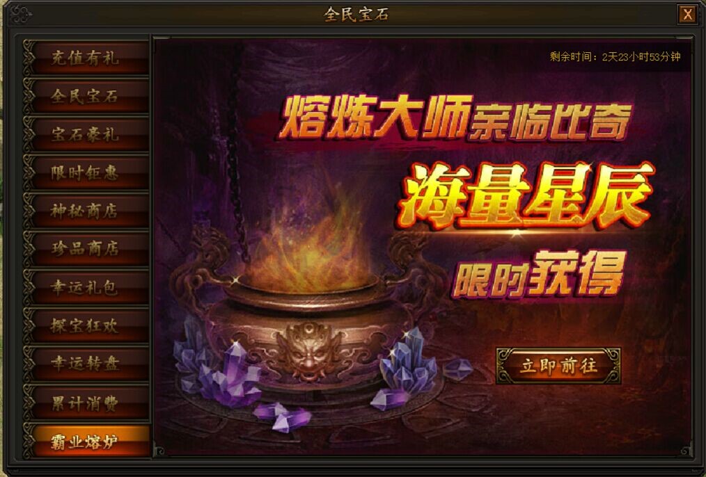 宝石竞技,豪礼相赠! 1. 充值有礼 活动时间:2018年6月26日0点——6月28日23:59 活动期间,充值元宝即可领取五档丰厚奖励,每天均可领取一次,不容错过! 2. 全民宝石 活动时间:2018年6月26日0点——6月28日23:59 活动期间,使用宝石结晶大、中、小材料获得宝石碎片,获得的宝石碎片达到一定数量即可领取大量材料返还,获得碎片越多,返还材料越多,升级宝石事半功倍! 3. 宝石豪礼 活动时间:2018年6月26日0点——6月28日23:59 活动期间,使用宝石结晶大、中、小材料获得宝石碎片,获得碎片数目达到8000即可参与碎片获得排行,有机会获得霸业装备、极品首饰奖励!活动结束后,奖励通过邮件发送。 4. 限时钜惠 活动时间:2018年6月26日0点——6月28日23:59 活动期间,材料礼包限时折扣,超低价格,不容错过! 5. 神秘商店 活动时间:2018年6月26日0点——6月28日23:59 活动期间,每两小时神秘商店会自动刷新一批道具,也可花费元宝立即刷新,大量道具限时等你抢购。 6. 珍品商店 活动时间:2018年6月26日0点——6月28日23:59 活动期间,每天会随机刷新一批特价道具,花费少量元宝即可购买,每个道具均有每天最大个人购买次数限制,部分道具有购买vip等级限制,买到就是赚到,机会不容错过! 7. 幸运礼包 活动时间:2018年6月26日0点——6月28日23:59 活动期间,每购买一次礼包可获得一次抽奖机会,还可花费元宝进行刷新!抽奖次数和礼包购买次数每日零点清零,请及时抽奖。 8. 探宝狂欢 活动时间:2018年6月26日0点——6月28日23:59 探宝超值回馈限时开启!活动期间探宝可获得祝福值,祝福值达到一定数值即可领取霸业装备奖励! 9. 幸运转盘 活动时间:2018年6月26日0点——6月28日23:59 活动期间,充值并消费一定元宝即可使用幸运转盘,获得大量霸业玉道具,使用霸业玉后即可前往霸业商城内购买珍稀道具,精彩不容错过。 10. 累计消费 活动时间:2018年6月26日0点——6月28日23:59 活动期间,累计消费一定数量元宝,即可领取对应档奖励,每个角色只能领取一次。 奖励内容根据开服天数不同而不同,具体奖励内容如下: | 2018年6月26日开服天数不足60天 | | | | | | | 超级转生丹*1、高级轮回丹*5、紫色符文宝箱·天命*1 | | 宝石结晶(大)*1、超级轮回丹*1、橙色符文宝箱·天命*1 | | 魂珠碎片(大)*1、超级轮回丹*2、刺客时装箱*1 | | 宝石结晶(大)*2、羽毛*300、转12首饰箱*1 | | 魂珠碎片(大)*2、羽毛*300、转14首饰箱*1 | | | | | | | | 超级龙魄精华*1、高级轮回丹*5、紫色符文宝箱·天命*1 | | 宝石结晶(大)*1、超级轮回丹*1、橙色符文宝箱·天命*1 | | 魂珠碎片(大)*1、超级轮回丹*2、刺客时装箱*1 | | 宝石结晶(大)*2、羽毛*300、转12首饰箱*1 | | 魂珠碎片(大)*2、羽毛*300、转14首饰箱*1 |