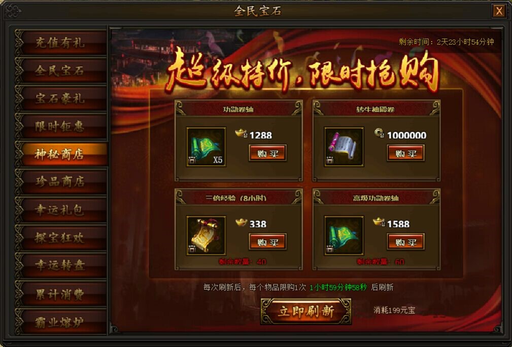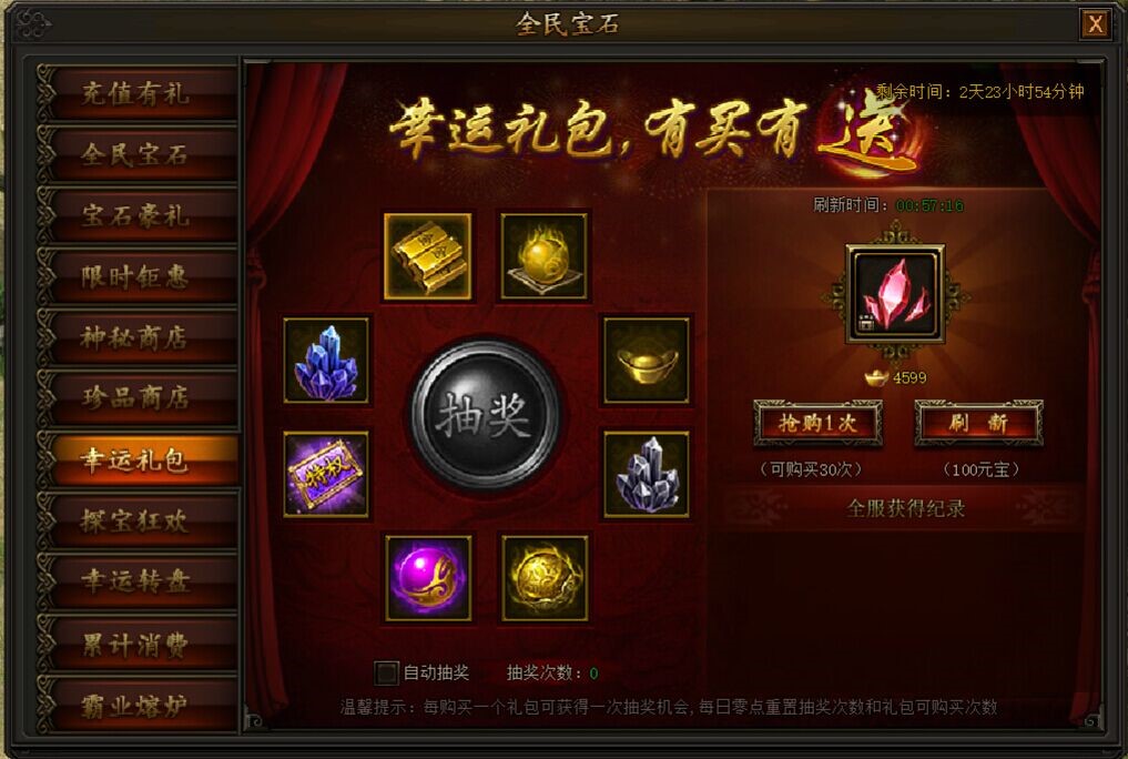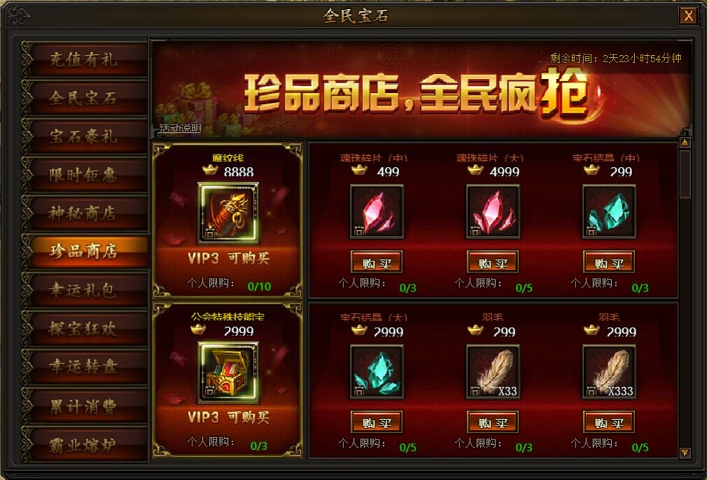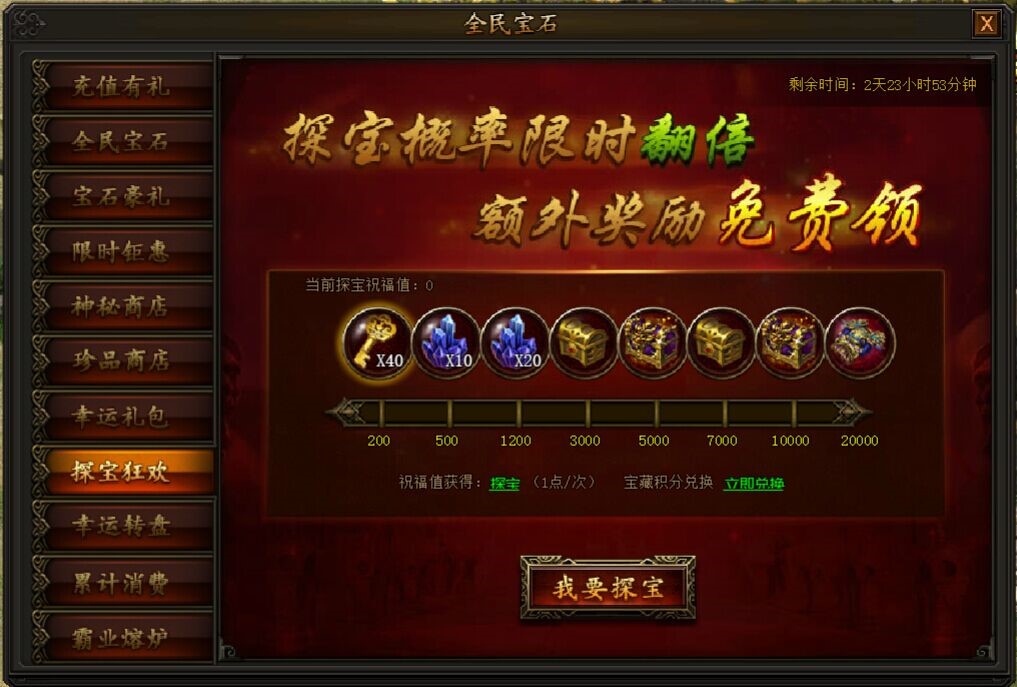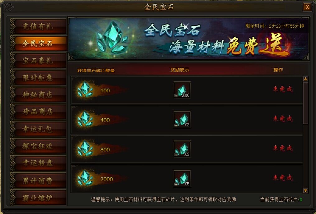 宝石竞技,豪礼相赠! 1. 充值有礼 活动时间:2018年6月26日0点——6月28日23:59 活动期间,充值元宝即可领取五档丰厚奖励,每天均可领取一次,不容错过! 2. 全民宝石 活动时间:2018年6月26日0点——6月28日23:59 活动期间,使用宝石结晶大、中、小材料获得宝石碎片,获得的宝石碎片达到一定数量即可领取大量材料返还,获得碎片越多,返还材料越多,升级宝石事半功倍! 3. 宝石豪礼 活动时间:2018年6月26日0点——6月28日23:59 活动期间,使用宝石结晶大、中、小材料获得宝石碎片,获得碎片数目达到8000即可参与碎片获得排行,有机会获得霸业装备、极品首饰奖励!活动结束后,奖励通过邮件发送。 4. 限时钜惠 活动时间:2018年6月26日0点——6月28日23:59 活动期间,材料礼包限时折扣,超低价格,不容错过! 5. 神秘商店 活动时间:2018年6月26日0点——6月28日23:59 活动期间,每两小时神秘商店会自动刷新一批道具,也可花费元宝立即刷新,大量道具限时等你抢购。 6. 珍品商店 活动时间:2018年6月26日0点——6月28日23:59 活动期间,每天会随机刷新一批特价道具,花费少量元宝即可购买,每个道具均有每天最大个人购买次数限制,部分道具有购买vip等级限制,买到就是赚到,机会不容错过! 7. 幸运礼包 活动时间:2018年6月26日0点——6月28日23:59 活动期间,每购买一次礼包可获得一次抽奖机会,还可花费元宝进行刷新!抽奖次数和礼包购买次数每日零点清零,请及时抽奖。 8. 探宝狂欢 活动时间:2018年6月26日0点——6月28日23:59 探宝超值回馈限时开启!活动期间探宝可获得祝福值,祝福值达到一定数值即可领取霸业装备奖励! 9. 幸运转盘 活动时间:2018年6月26日0点——6月28日23:59 活动期间,充值并消费一定元宝即可使用幸运转盘,获得大量霸业玉道具,使用霸业玉后即可前往霸业商城内购买珍稀道具,精彩不容错过。 10. 累计消费 活动时间:2018年6月26日0点——6月28日23:59 活动期间,累计消费一定数量元宝,即可领取对应档奖励,每个角色只能领取一次。 奖励内容根据开服天数不同而不同,具体奖励内容如下: | 2018年6月26日开服天数不足60天 | | | | | | | 超级转生丹*1、高级轮回丹*5、紫色符文宝箱·天命*1 | | 宝石结晶(大)*1、超级轮回丹*1、橙色符文宝箱·天命*1 | | 魂珠碎片(大)*1、超级轮回丹*2、刺客时装箱*1 | | 宝石结晶(大)*2、羽毛*300、转12首饰箱*1 | | 魂珠碎片(大)*2、羽毛*300、转14首饰箱*1 | | | | | | | | 超级龙魄精华*1、高级轮回丹*5、紫色符文宝箱·天命*1 | | 宝石结晶(大)*1、超级轮回丹*1、橙色符文宝箱·天命*1 | | 魂珠碎片(大)*1、超级轮回丹*2、刺客时装箱*1 | | 宝石结晶(大)*2、羽毛*300、转12首饰箱*1 | | 魂珠碎片(大)*2、羽毛*300、转14首饰箱*1 |
