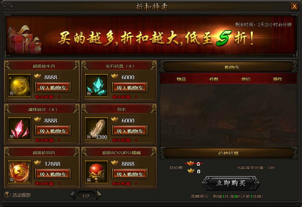 11. 霸业熔炉 活动时间:2018年6月26日0点——6月28日23:59 活动期间,熔炼大师出现在比奇城,熔炼5转及以上转升装备,百分百获得星辰晶石,机会难得不容错过,开服15天及以上的区服所有玩家才可参与。 12. 折扣特卖 活动时间:2018年6月26日0点——6月28日23:59 活动期间福利大放送,购买折扣特卖中所有商品都有折扣优惠,买得越多,折扣越大。
