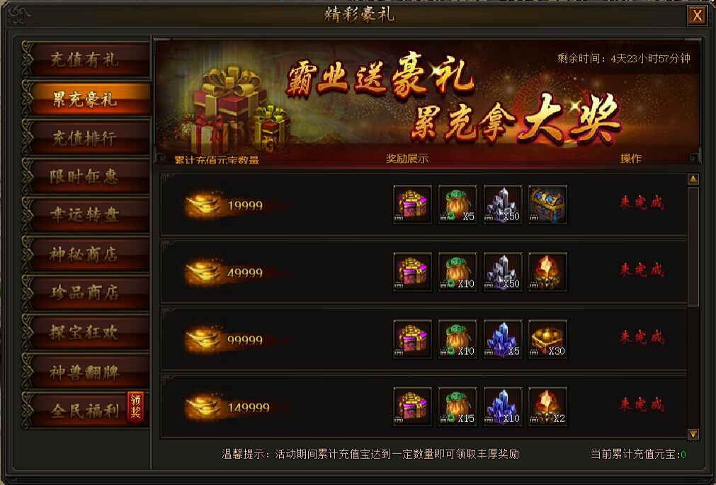 活动期间,累计充值一定数量元宝,即可领取对应档奖励,每个角色只能领取一次。