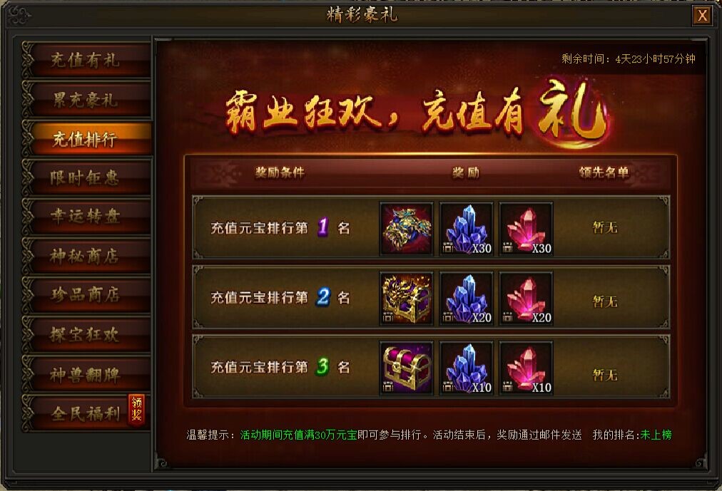 活动期间,累计充值元宝数满30w可参与排行,排行前三即可获得对应霸业装备和极品首饰奖励。