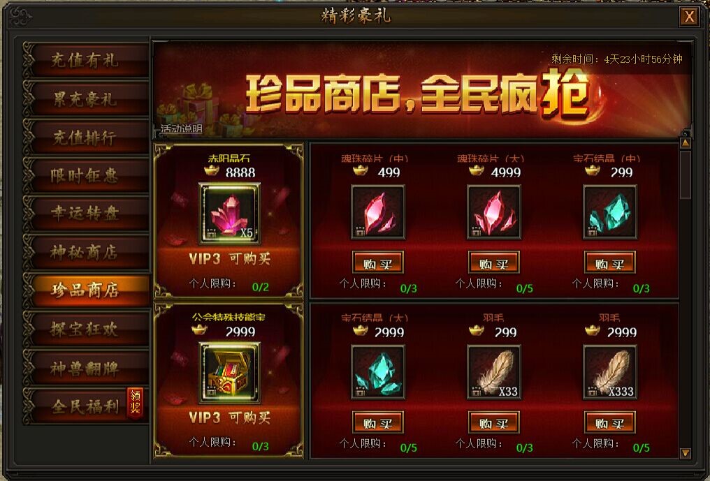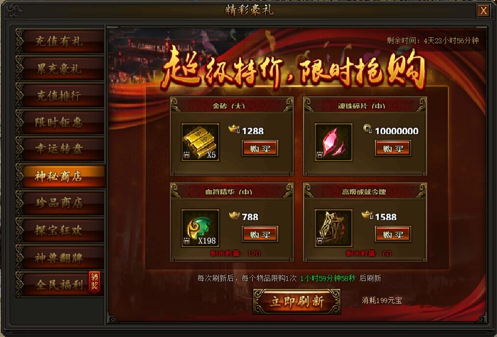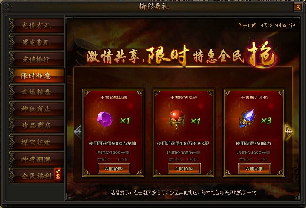 活动期间,每天会随机刷新一批特价道具,花费少量元宝即可购买,每个道具均有每天最大个人购买次数限制,部分道具有购买vip等级限制,买到就是赚到,机会不容错过!