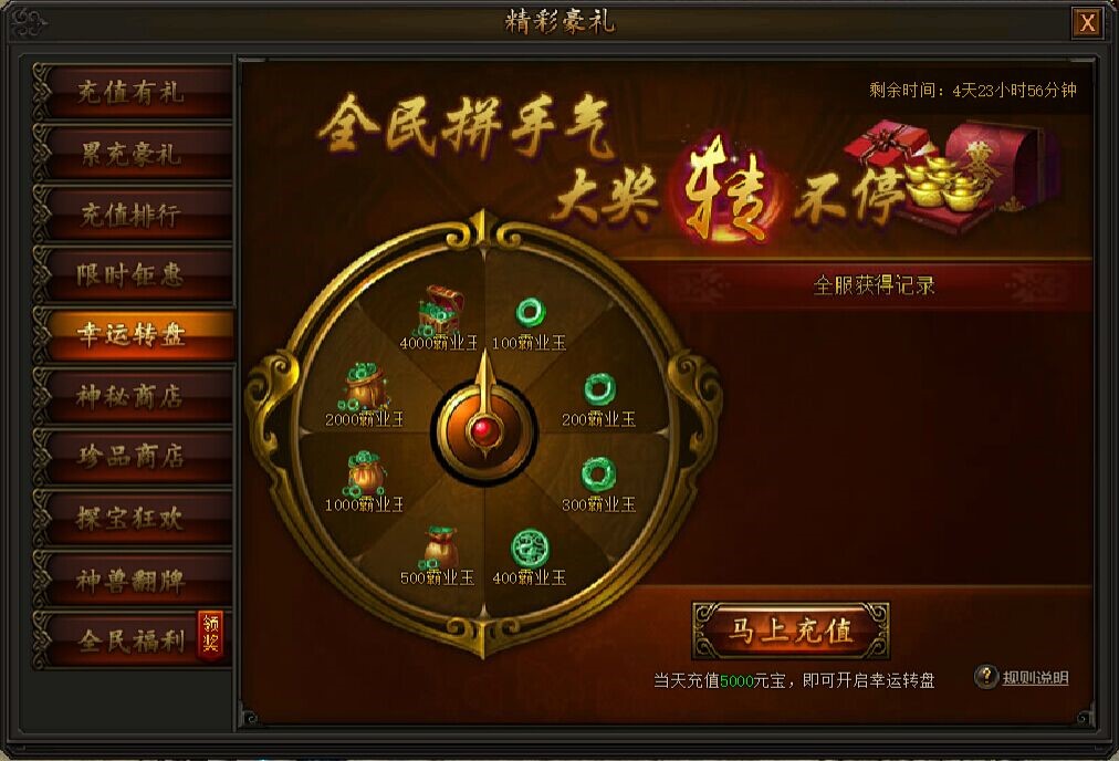 活动期间,充值并消费一定元宝即可使用幸运转盘,获得大量霸业玉道具,使用霸业玉后即可前往霸业商城内购买珍稀道具,精彩不容错过。