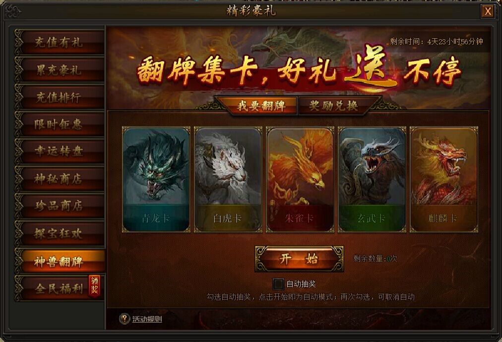 活动期间,每充值2000元宝,可获得一次翻牌机会,抽取一张卡片;集齐各类卡牌,可组合兑换不同档次的奖励。