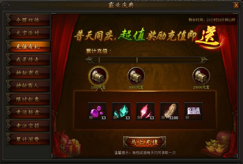 活动期间,充值元宝即可领取三档丰厚奖励,每天均可领取一次,不容错过!