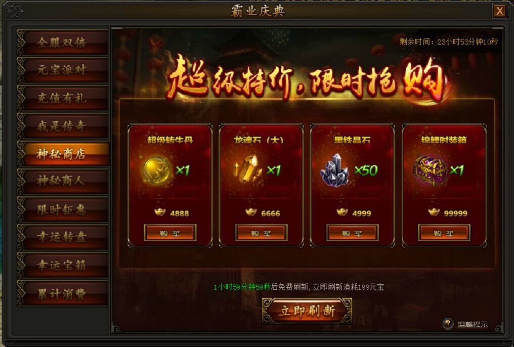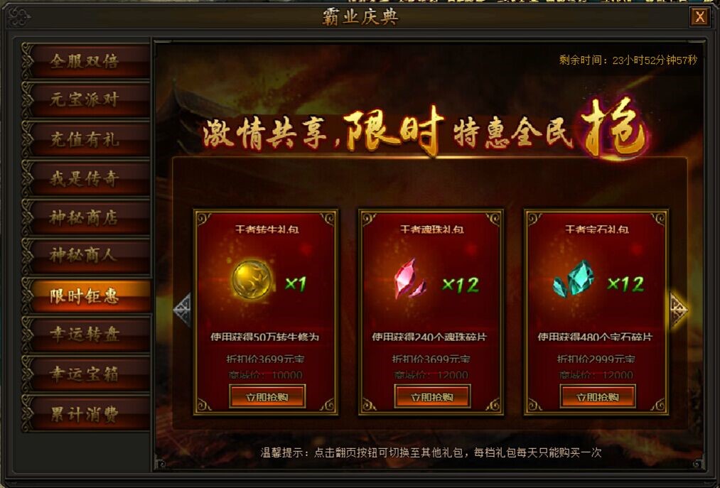 活动期间,转生、魂珠、宝石、内功、羽毛和轮回等材料礼包限时折扣,超低价格,仅此一天不容错过!