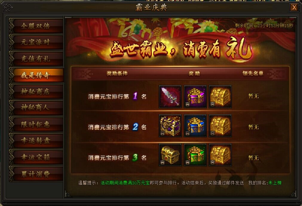 活动期间,累计消费满30w元宝即可参与排行,排行前3名即可获得霸业以及高级转生装备,豪礼不容错过。