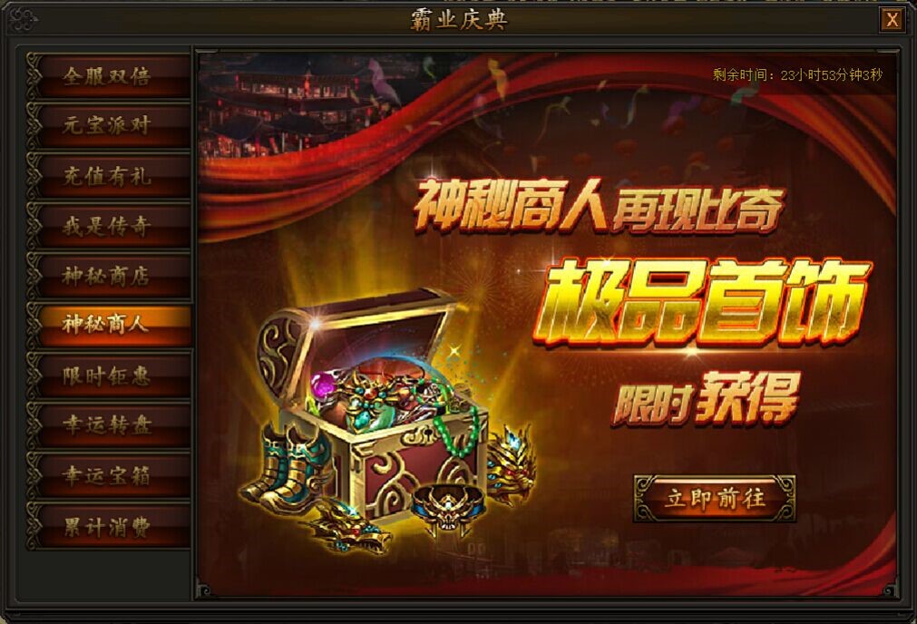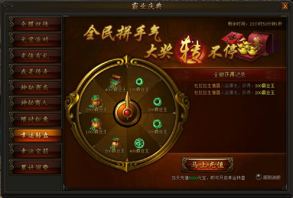 活动期间,充值并消费一定元宝即可使用幸运转盘,获得大量霸业玉道具,使用霸业玉后即可前往霸业商城内购买珍稀道具,精彩不容错过。