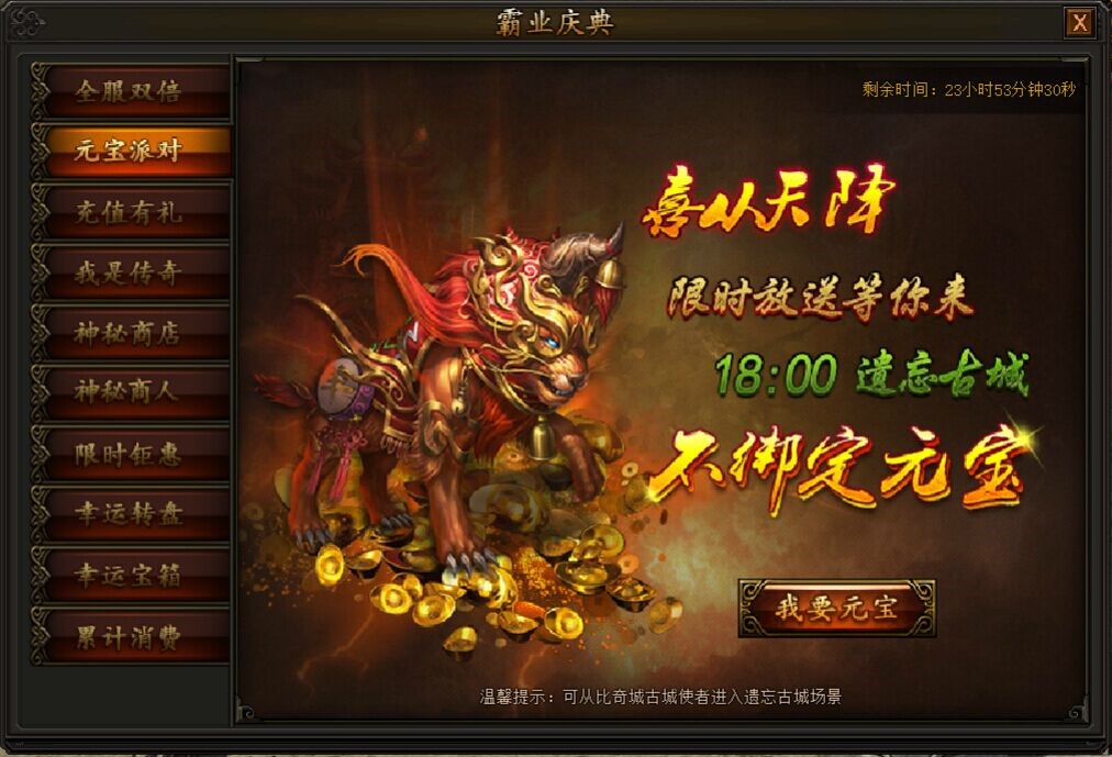 活动期间下午18:00,可通过比奇城古城使者NPC处进入遗忘古城,击杀boss后掉落不绑定元宝,掉落物品无归属。
