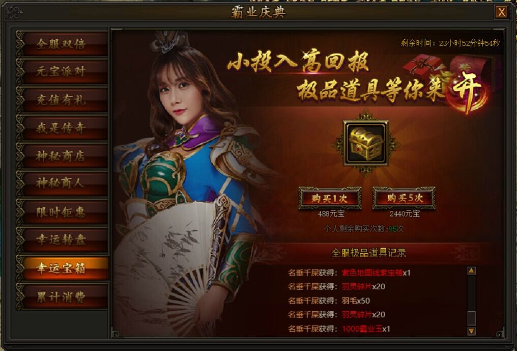 活动期间,80级以上(包含80级)玩家每天最多可购买200次,打开幸运宝箱可随机获得一种道具,多买多得,极品道具等你来开,更有机会获得珍稀地图线索道具!