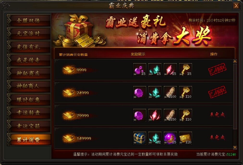 活动期间,累计消费一定数量元宝,即可领取对应档奖励,每个角色只能领取一次。