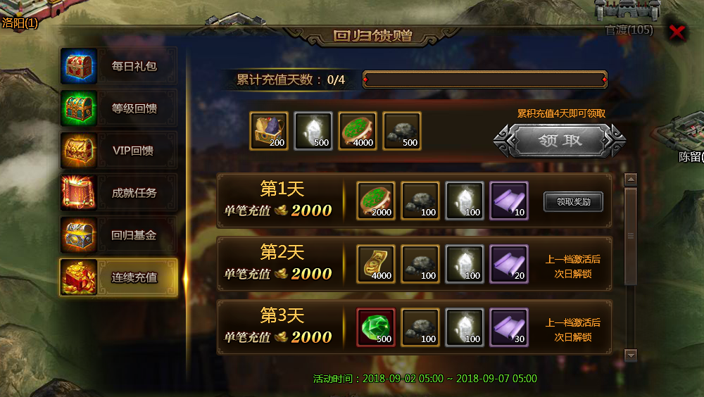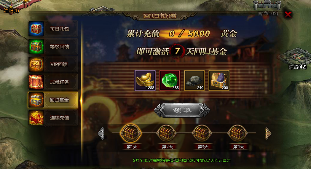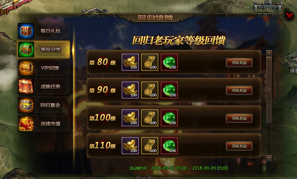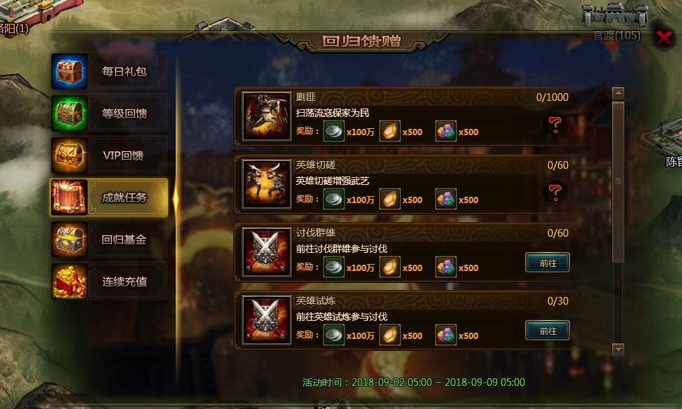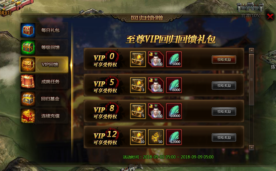 老玩家回归升级 活动名称: 老玩家回归 活动时间: 2018年8月13日5:00起,符合回归条件,并5天内登陆激活 回归时间: 2018年7月14日起未登录用户 活动内容: 超过30天离线用户,从8月13日5:00起登陆游戏激活老玩家回归活动,就可参加 活动1:每日礼包 每天登陆领取对应奖励 活动2:等级回馈 符合等级条件领取对应奖励 活动3:VIP回馈 符合VIP等级领取对应奖励 活动4:成就任务 完成对应任务领取奖励 活动5:回归基金 完成充值要求每日领取对应奖励 活动6:连续充值 每日充值可领取对应奖励 打造一个真实的三国世界,是《大皇帝》的设计初衷。追寻记忆里的三国情怀,是我们共同的愿望。感谢大家和我们一起见证《大皇帝》的诞生和成长,希望您一如既往地支持我们,支持《大皇帝》! |