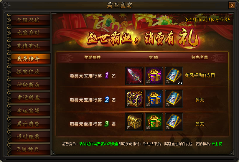 活动期间,累计消费满30w元宝即可参与排行,排行前3名即可获得霸业以及高级转生装备,豪礼不容错过。