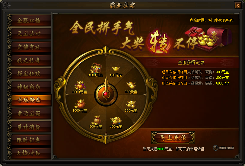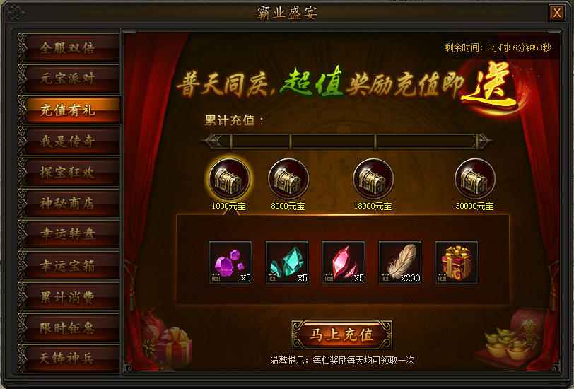 活动期间,充值元宝即可领取四档丰厚奖励,每天均可领取一次,不容错过!