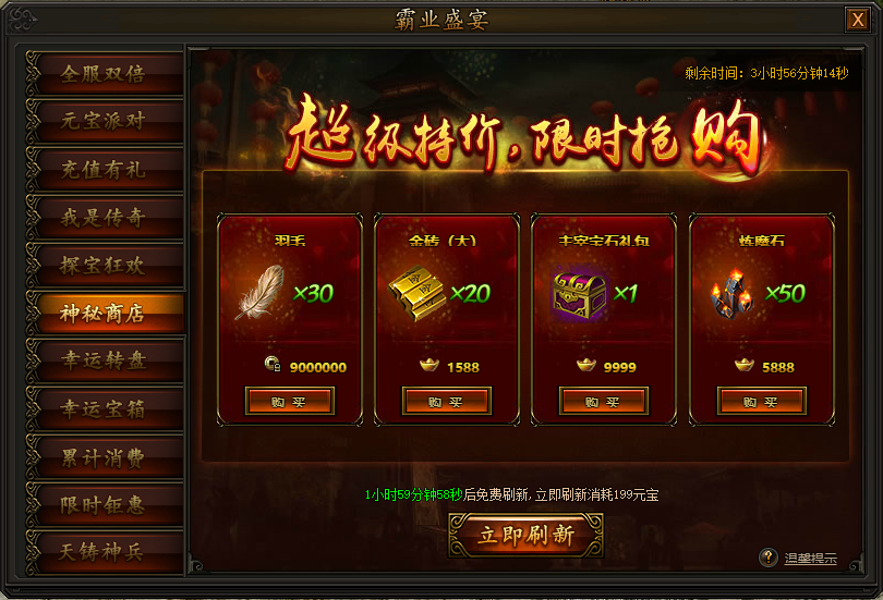 活动期间,每两小时神秘商店会自动刷新一批道具,也可花费元宝立即刷新,大量道具限时等你抢购。
