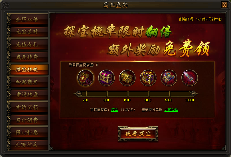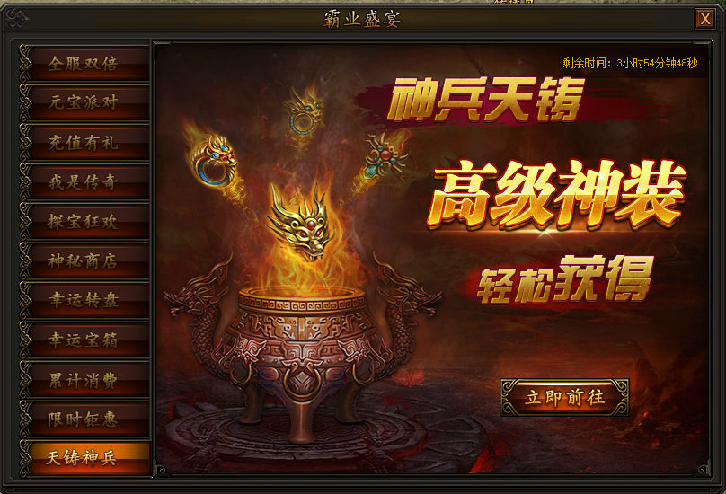 活动期间,天铸神兵限时出现在比奇城,投入低级神装,花费少量元宝即有机会获得更高级神装,从此快人一步,集齐高阶神装不是梦!