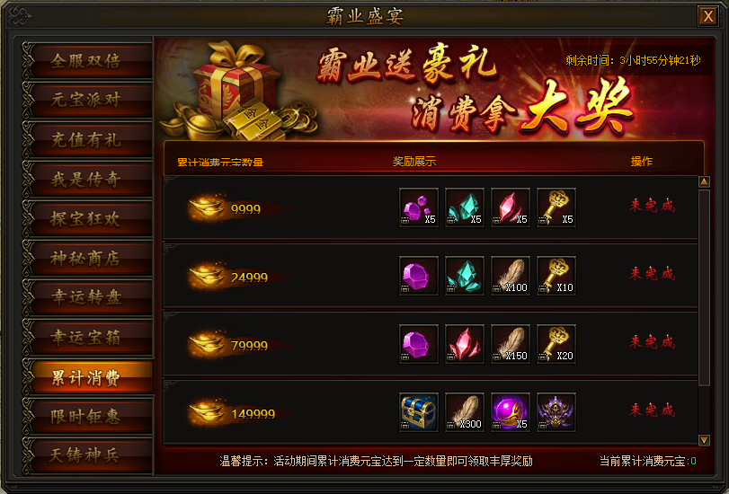 活动期间,累计消费一定数量元宝,即可领取对应档奖励,每个角色只能领取一次。