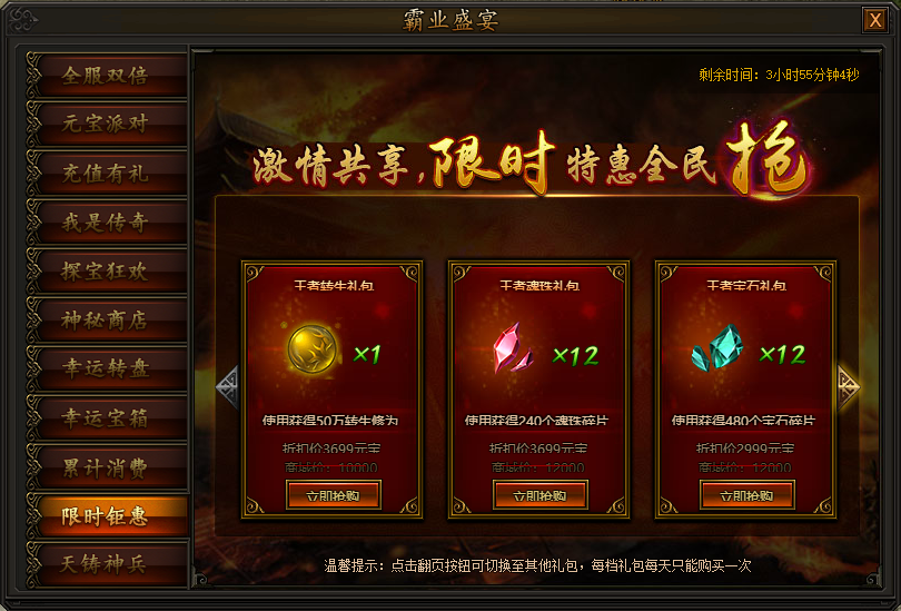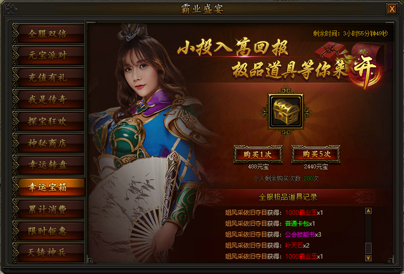 活动期间,80级以上(包含80级)玩家每天最多可购买500次,打开幸运宝箱可随机获得一种道具,多买多得,极品道具等你来开!