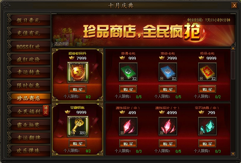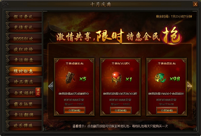 活动期间,每天会随机刷新一批特价道具,花费少量元宝即可购买,每个道具均有每天最大个人购买次数限制,部分道具有购买vip等级限制,买到就是赚到,机会不容错过!