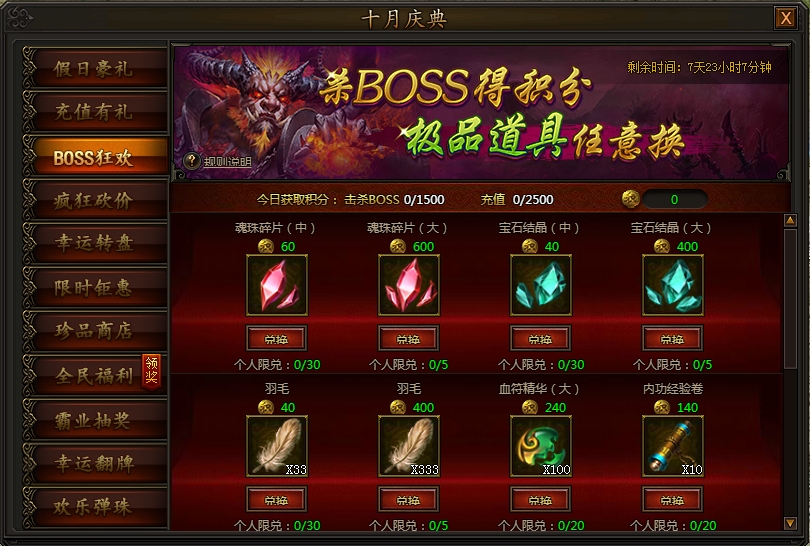 活动期间,击杀野外BOSS及充值可以获得积分,有每日获得积分上限;消耗积分可以兑换超值豪礼,每个道具在活动期间有最大个人兑换上限!