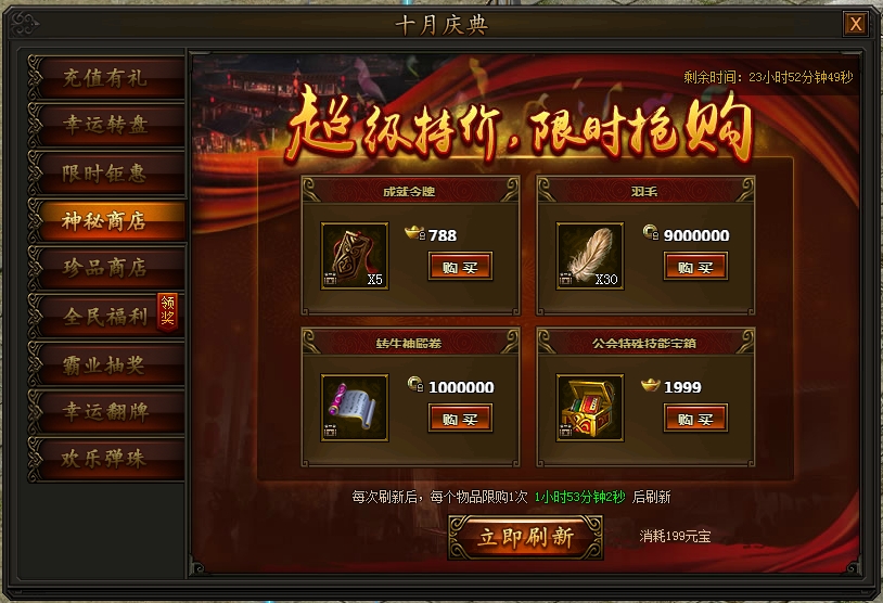 活动期间,每两小时神秘商店会自动刷新一批道具,也可花费元宝立即刷新,大量道具限时等你抢购,数量有限,先买先得。