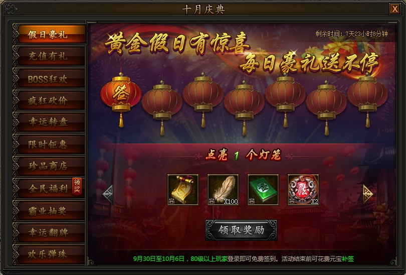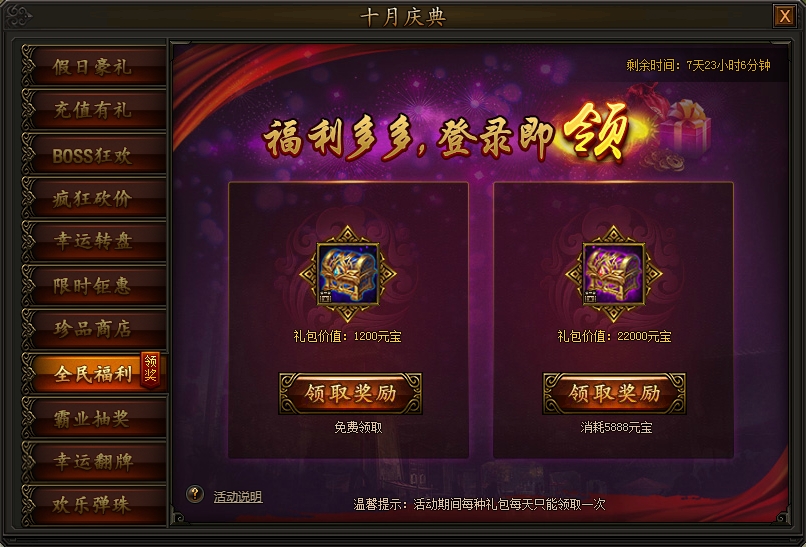活动期间,80级及以上玩家登录即可领取免费礼包,花费一定数量元宝还可购买超值礼包,每个角色每种礼包每天只能领取一次!