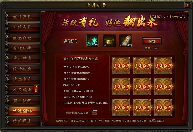 活动期间,完成活跃任务可以获得翻牌机会,还可消耗少量元宝购买翻牌次数,翻开三张相同的牌即可获得该奖励。