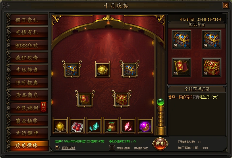 活动期间,每消费199元宝即可进行一次弹射,每天弹射上限为300次,可获得海量材料奖励,更有机会获得免伤时装一件,心动不如行动!