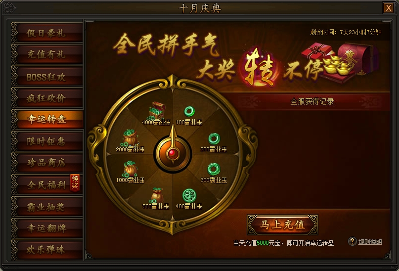 活动期间,充值并消费一定元宝即可使用幸运转盘,获得大量霸业玉道具,使用霸业玉后即可前往霸业商城内购买珍稀道具,精彩不容错过。