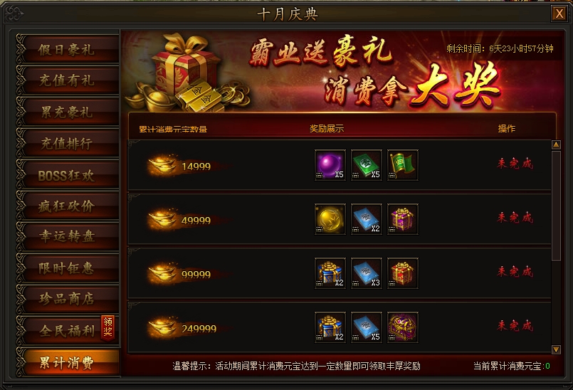 活动期间,累计消费一定数量元宝,即可领取对应档奖励,每个角色只能领取一次。