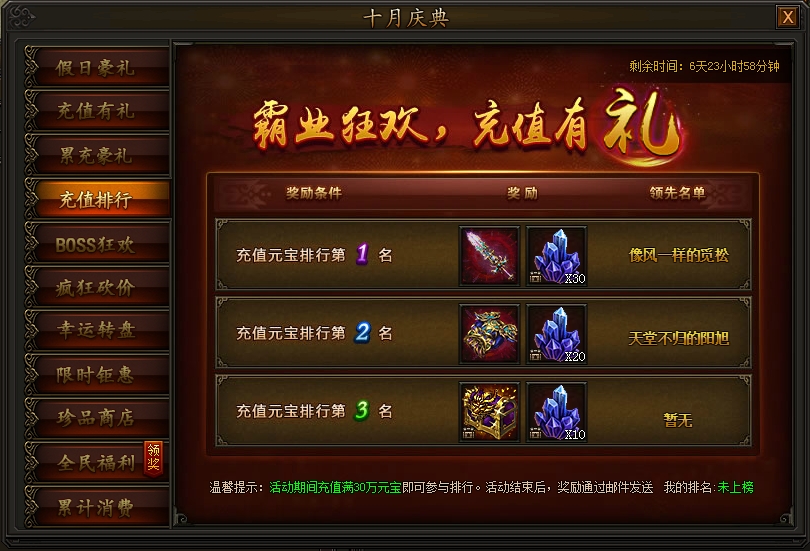 活动期间,累计充值元宝数满30w可参与排行,排行前三即可获得对应霸业装备和极品首饰奖励。