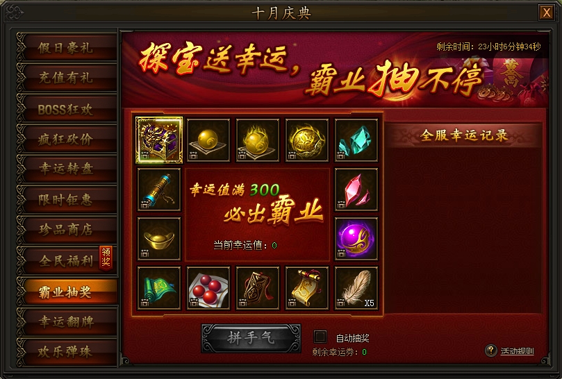 活动期间每探宝5次即送一张幸运券,可用于参与霸业抽奖,有机会获得海量材料和霸业装备!每次抽奖即可获得一点幸运值,幸运值达到300点抽奖必出霸业装备箱!
