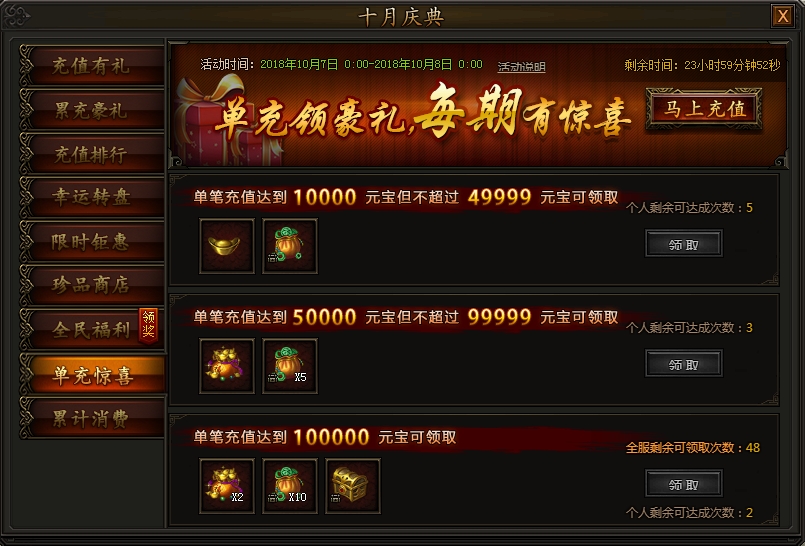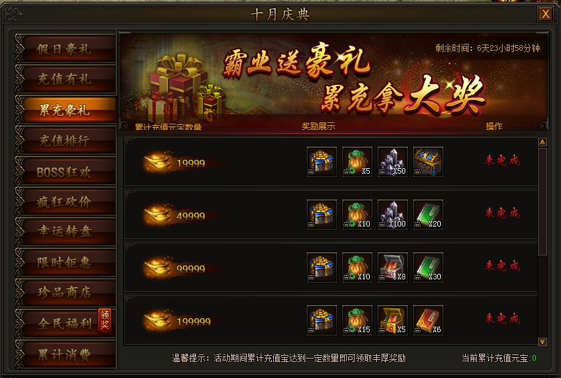 活动期间,累计充值一定数量元宝,即可领取对应档奖励,每个角色只能领取一次。