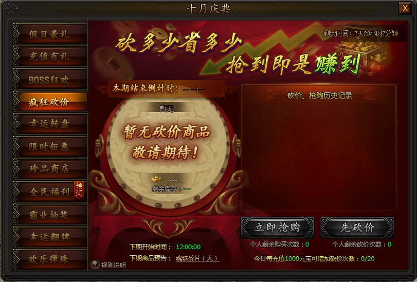 活动期间,每天均有两期商品,每充值1000元宝即可获得砍价次数,每天有最高砍价次数上限,每个商品均有最低砍价价格,每天0点重置个人剩余砍价次数,最后一天还有机会获得人中之龙永久称号,机会有限,不容错过;
