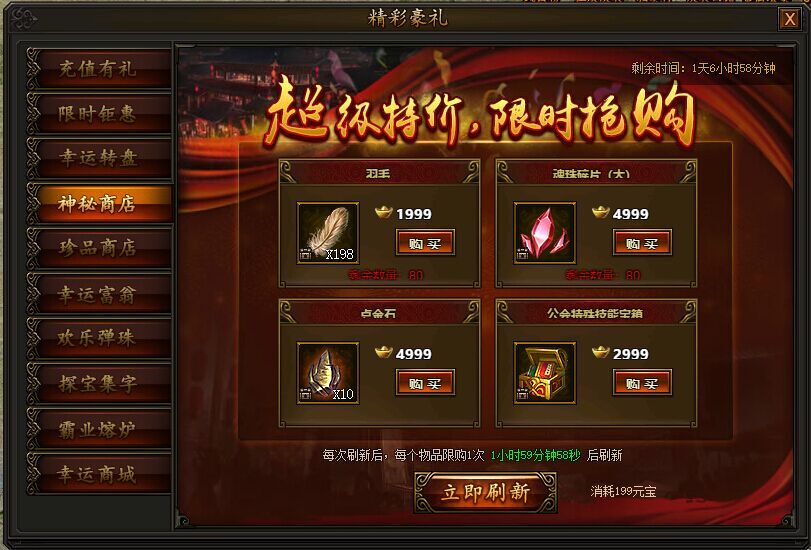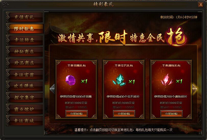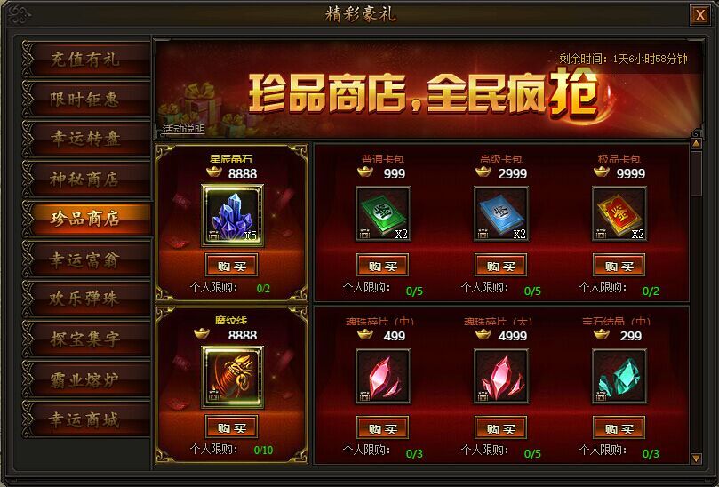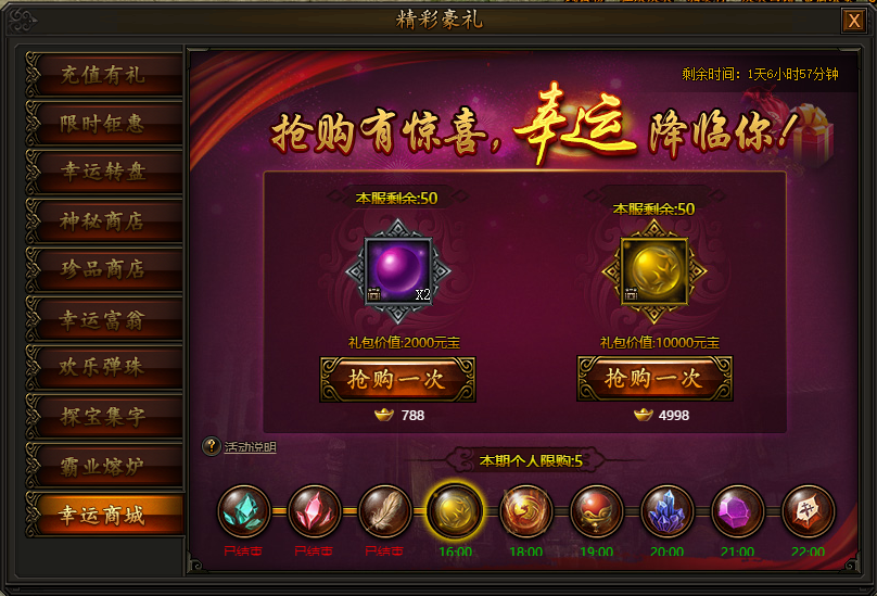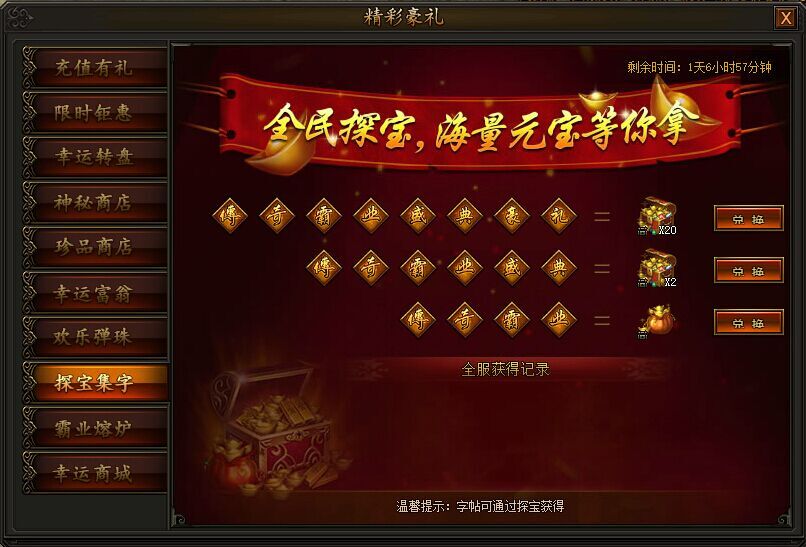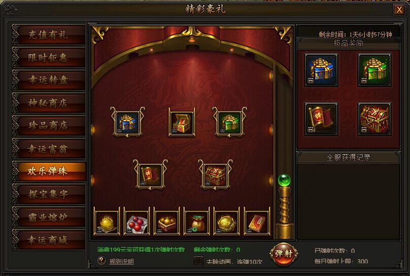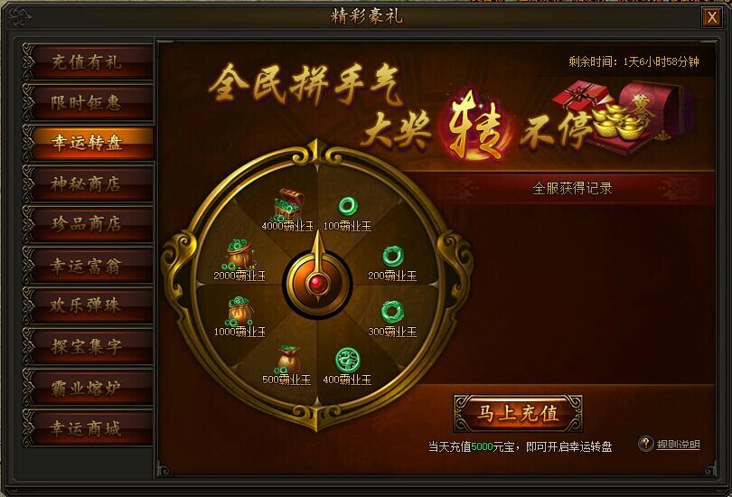 精彩豪礼,海量材料送不停! 1. 充值有礼 活动时间:2018年10月16日0点——10月17日23:59 活动期间,充值元宝即可领取四档丰厚奖励,每天均可领取一次,不容错过! 2. 限时钜惠 活动时间:2018年10月16日0点——10月17日23:59 活动期间,超低价格材料礼包限时折扣,不容错过! 3. 幸运转盘 活动时间:2018年10月16日0点——10月17日23:59 活动期间,充值并消费一定元宝即可使用幸运转盘,获得大量霸业玉道具,使用霸业玉后即可前往霸业商城内购买珍稀道具,精彩不容错过。 4. 神秘商店 活动时间:2018年10月16日0点——10月17日23:59 活动期间,每两小时神秘商店会自动刷新一批道具,也可花费元宝立即刷新,大量道具限时等你抢购,还有机会获得限时特价足球时装,数量有限,先买先得。 5. 珍品商店 活动时间:2018年10月16日0点——10月17日23:59 活动期间,每天会随机刷新一批特价道具,花费少量元宝即可购买,每个道具均有每天最大个人购买次数限制,部分道具有购买vip等级限制,买到就是赚到,机会不容错过! 6. 幸运富翁 活动时间:2018年10月16日0点——10月17日23:59 活动期间,充值一定元宝即可参与幸运大富翁,获得丢骰子次数,转动骰子即可获得踩中格子上的豪华奖励,多次参与累计步数,更有机会得到时装宝箱和极品转生装备奖励! 7. 欢乐弹珠 活动时间:2018年10月16日0点——10月17日23:59 活动期间,每消费199元宝即可进行一次弹射,每天弹射上限为300次,可获得海量材料奖励,更有机会获得免伤时装一件,心动不如行动! 8. 探宝集字 活动时间:2018年10月16日0点——10月17日23:59 活动期间,探宝可能获得“传奇霸业盛典豪礼”字帖,集齐字帖可兑换海量不绑定元宝奖励! 9. 霸业熔炉 活动时间:2018年10月16日0点——10月17日23:59 活动期间,熔炼大师出现在比奇城,熔炼5转及以上转升装备,百分百获得星辰晶石,机会难得不容错过,开服15天及以上的区服所有玩家才可参与。 10. 幸运商城 活动时间:2018年10月16日0点——10月17日23:59 活动期间,每隔一段时间,商城限时上架一批新道具(全服限量),每轮每个角色有最大购买次数,折扣多多,不容错过。