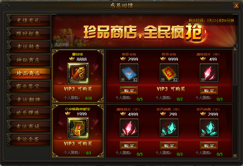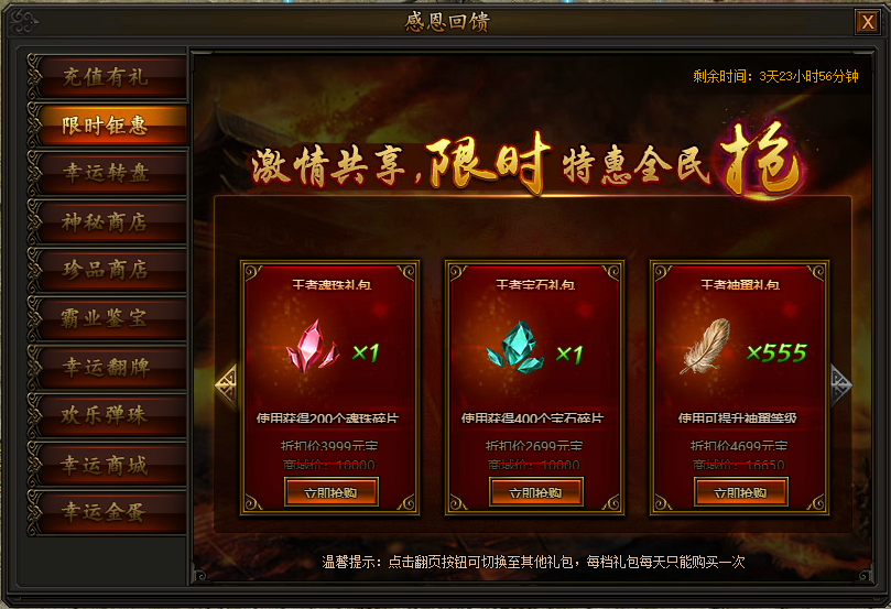 活动期间,每天会随机刷新一批特价道具,花费少量元宝即可购买,每个道具均有每天最大个人购买次数限制,部分道具有购买vip等级限制,买到就是赚到,机会不容错过!