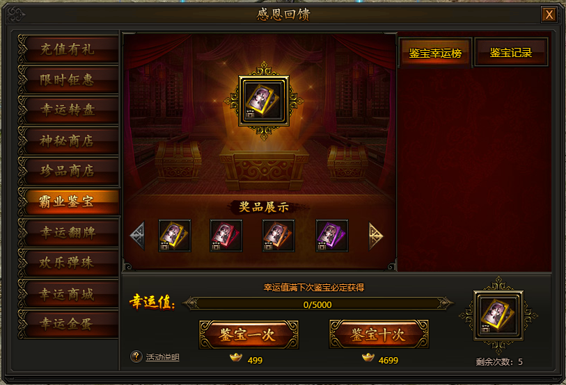 活动期间,花费一定数量元宝即可进行霸业鉴宝,每次鉴宝均可获得祝福值,祝福值满后下一次鉴宝必出极品大奖,数量有限,不容错过。