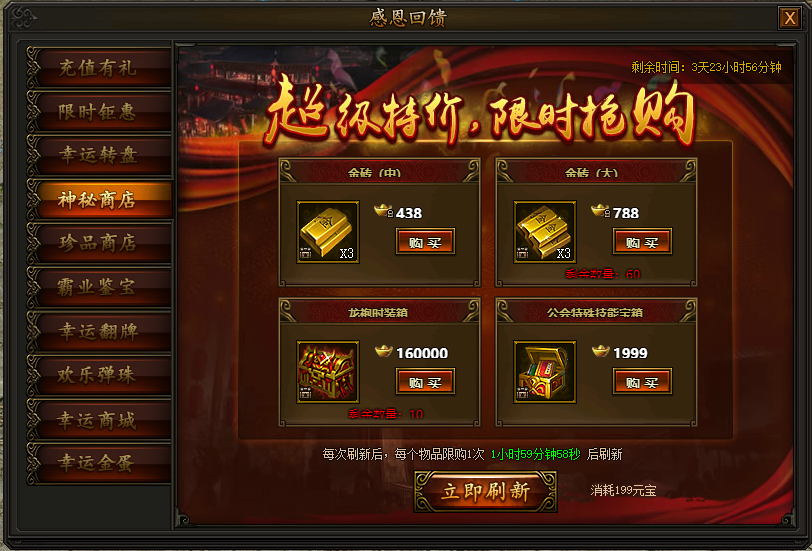 活动期间,每两小时神秘商店会自动刷新一批道具,也可花费元宝立即刷新,大量道具限时等你抢购,数量有限,先买先得。