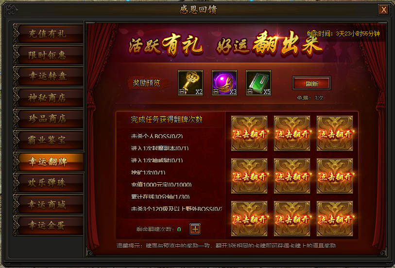 活动期间,完成活跃任务可以获得翻牌机会,翻到三张相同的牌可获得奖励。