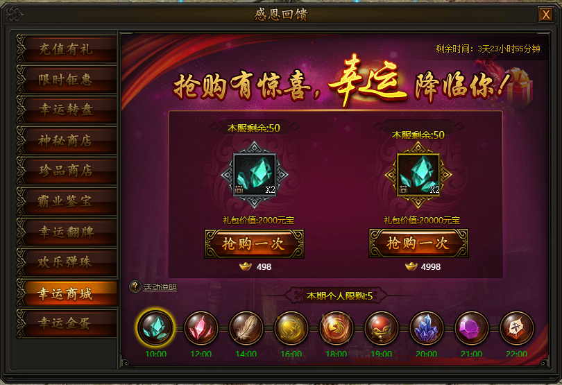 活动期间,每隔一段时间,商城限时上架一批新道具(全服限量),每轮每个角色有最大购买次数,折扣多多,不容错过。