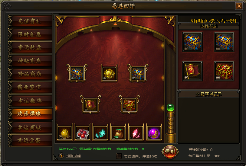 活动期间,每消费199元宝即可进行一次弹射,每天弹射上限为300次,可获得海量材料奖励,更有机会获得免伤时装一件,心动不如行动!