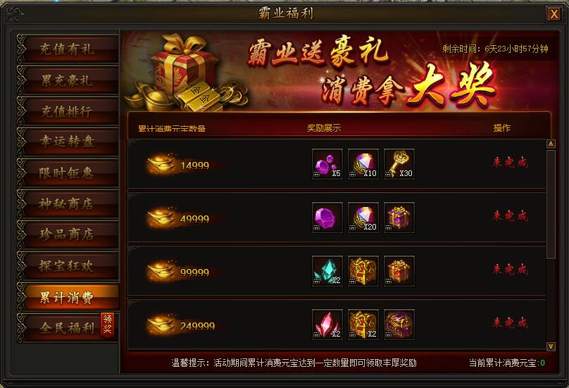 活动期间,累计消费一定数量元宝,即可领取对应档奖励,每个角色只能领取一次。