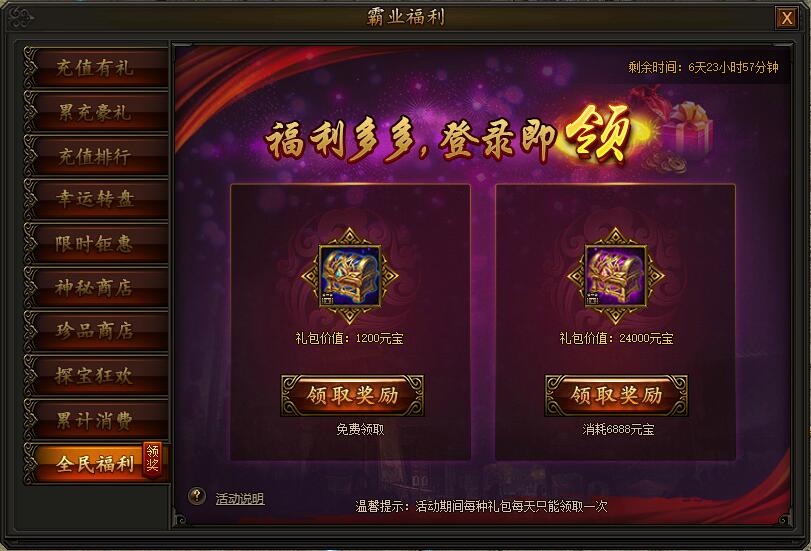 活动期间,80级及以上玩家登录即可领取免费礼包,花费一定数量元宝还可购买超值礼包,每个角色每种礼包每天只能领取一次!