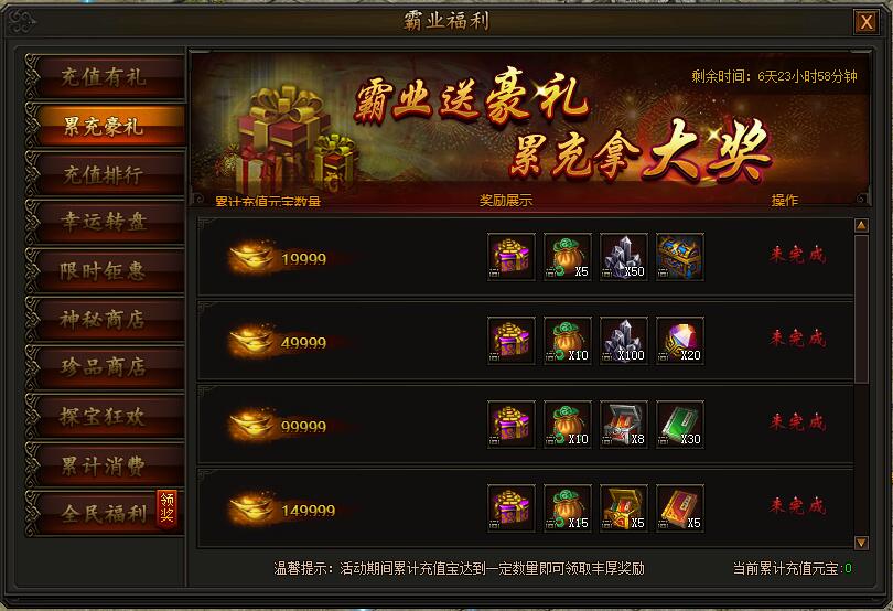 活动期间,累计充值一定数量元宝,即可领取对应档奖励,每个角色只能领取一次。
