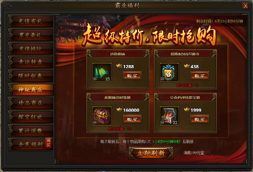 活动期间,每两小时神秘商店会自动刷新一批道具,也可花费元宝立即刷新,大量道具限时等你抢购,数量有限,先买先得。
