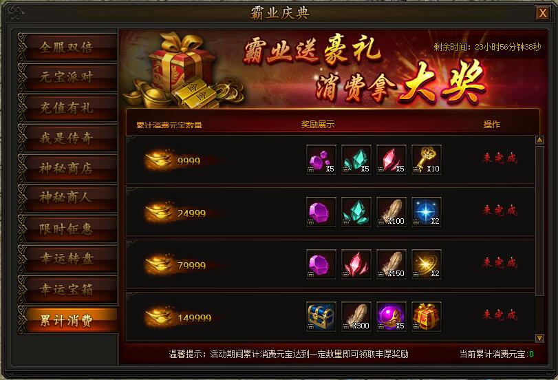 活动期间,累计消费一定数量元宝,即可领取对应档奖励,每个角色只能领取一次。