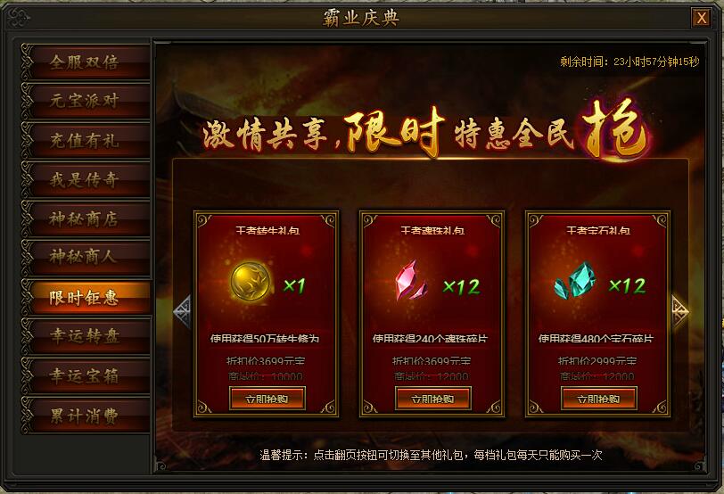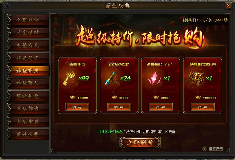 活动期间,每两小时神秘商店会自动刷新一批道具,也可花费元宝立即刷新,大量道具限时等你抢购。