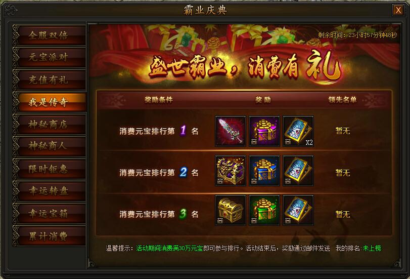活动期间,累计消费满30w元宝即可参与排行,排行前3名即可获得霸业以及高级转生装备,豪礼不容错过。