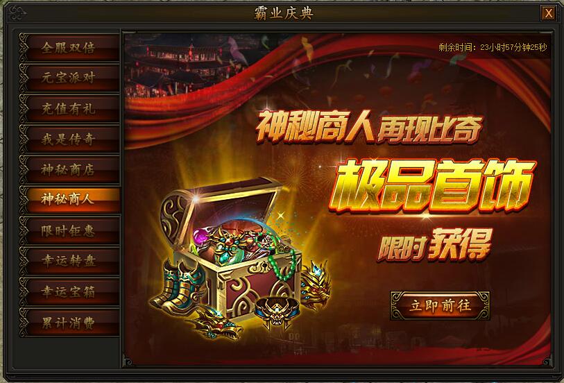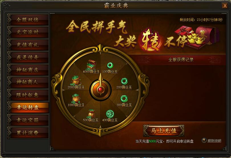 活动期间,充值并消费一定元宝即可使用幸运转盘,获得大量霸业玉道具,使用霸业玉后即可前往霸业商城内购买珍稀道具,精彩不容错过。